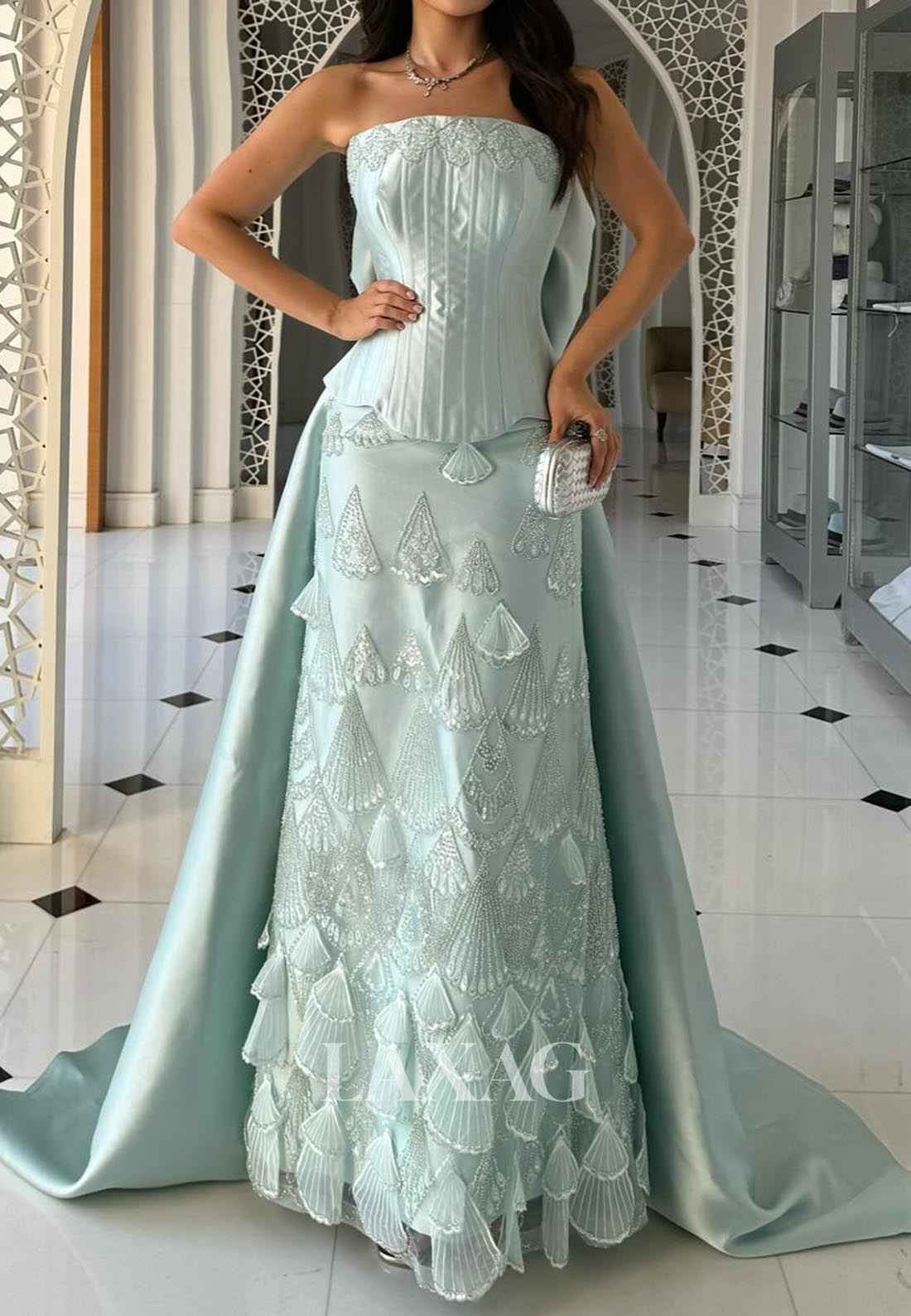 Captivate every gaze in this stunning off-shoulder mermaid evening dress. The sleeveless tube top design accentuates your shoulders while exquisite beading adds a touch of glamour. Crafted from luxurious pleated satin that flows into a dramatic train, this gown creates an unforgettable silhouette that commands attention at any formal event. Make an entrance that leaves a lasting impression.
