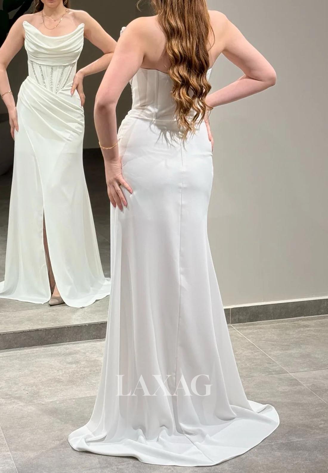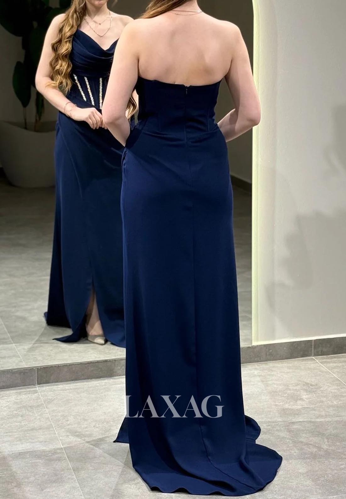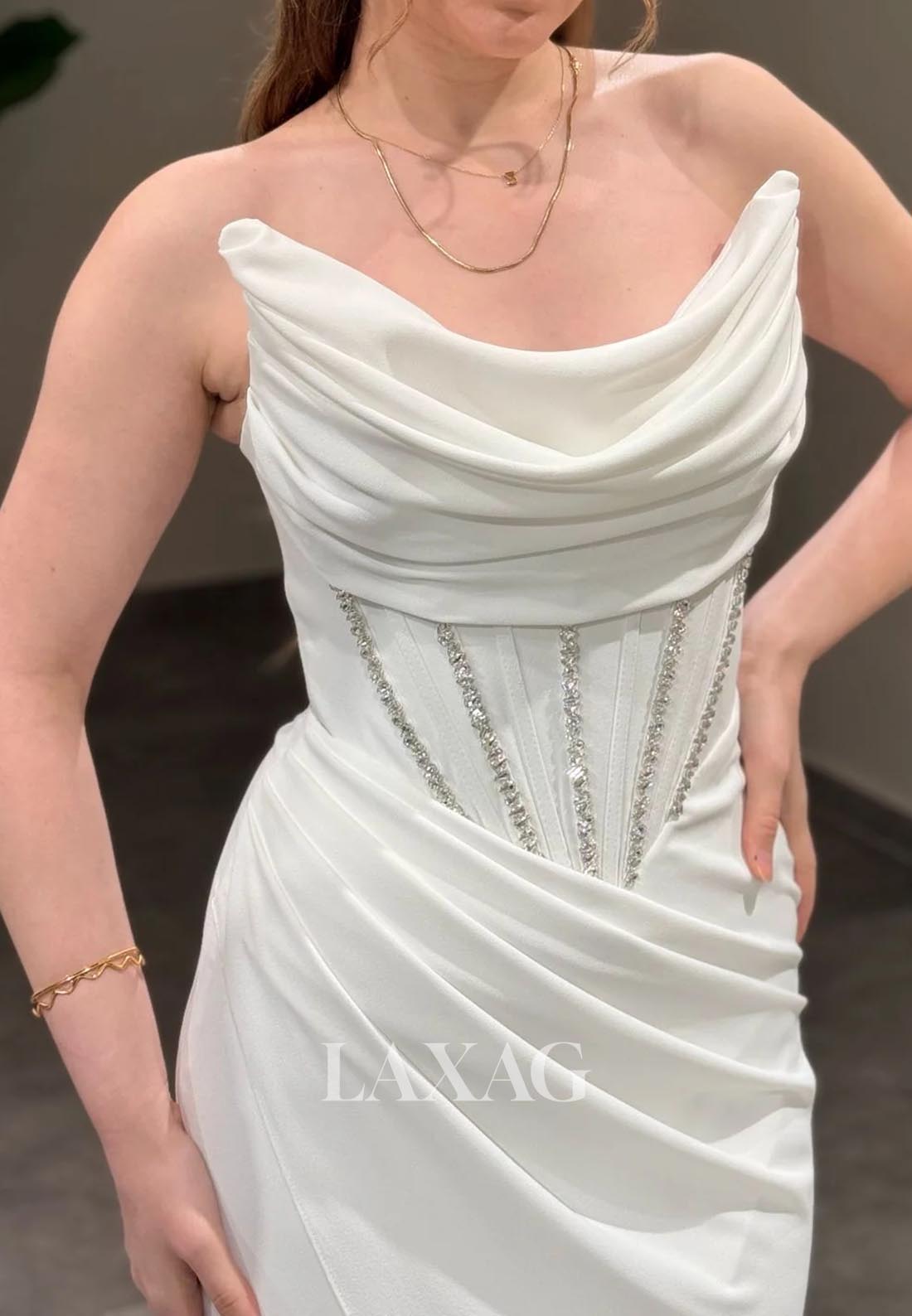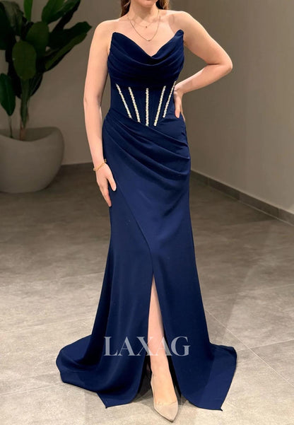 Scoop-Neck Off-Shoulder Pleated Satin Mermaid Evening Dress Sleeveless Beaded Formal Gowns