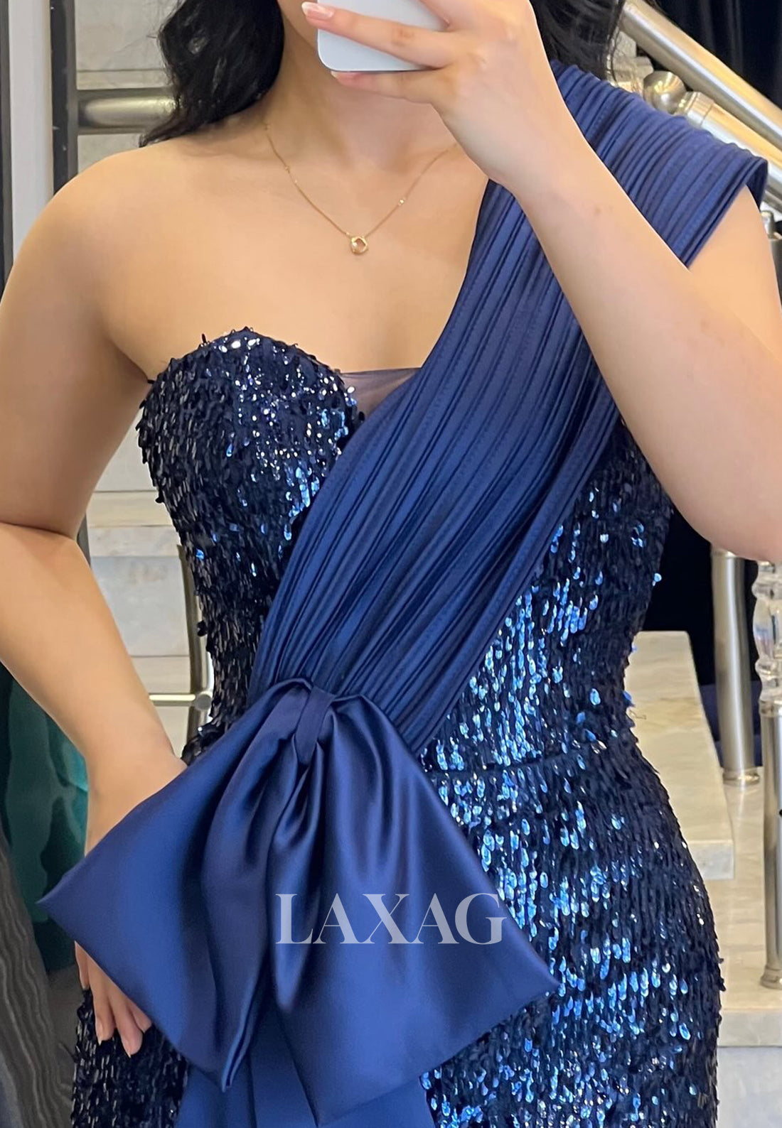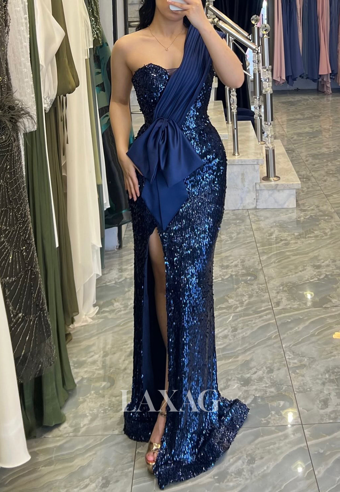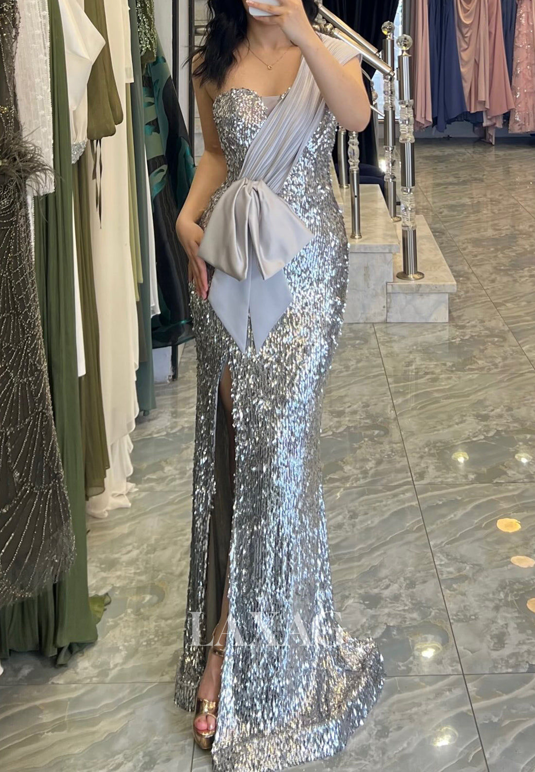 Sweetheart Sleeveless Mermaid Evening Gowns One-Strap Fully Sequined Pleated High Slit Prom Dress