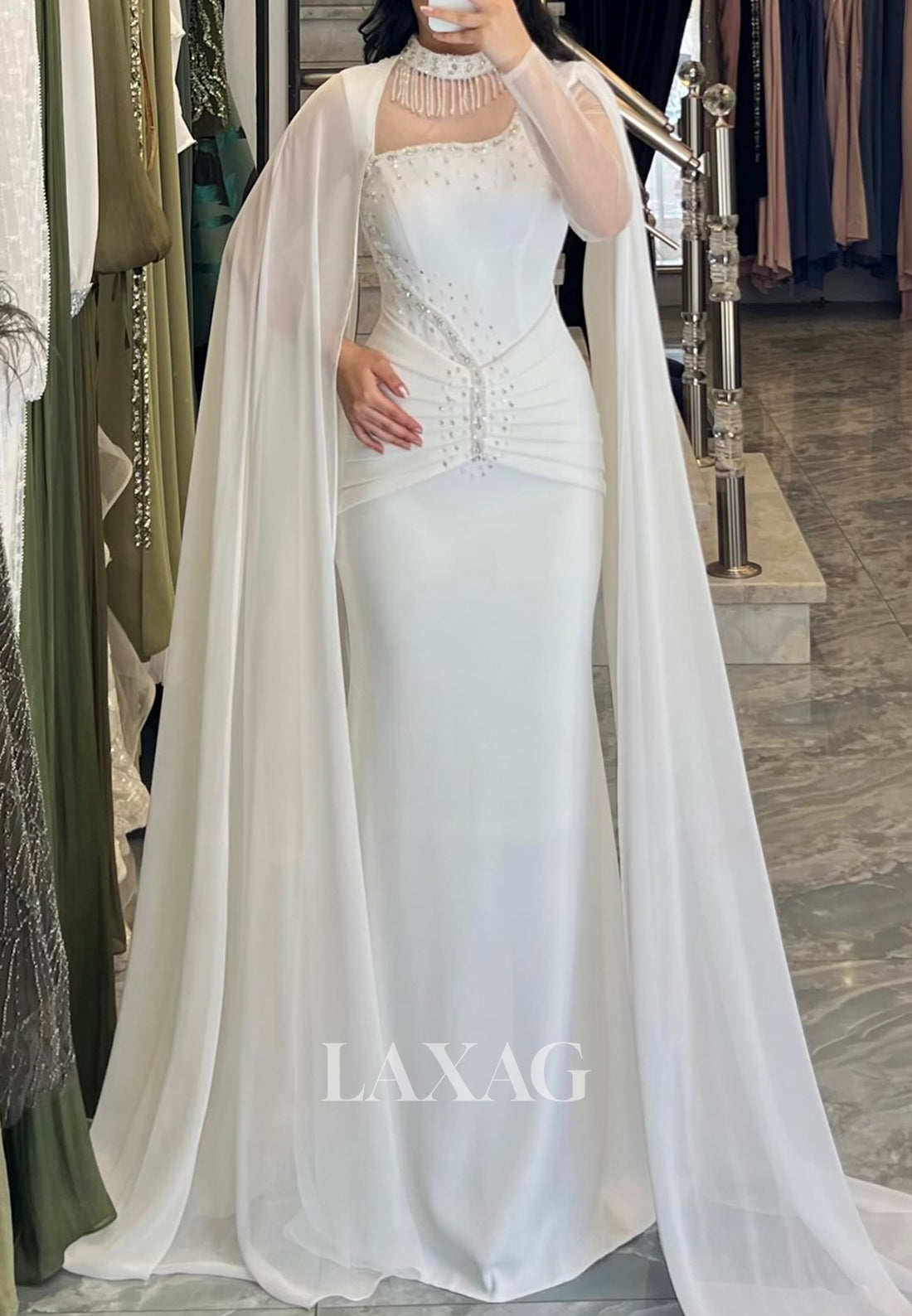 Asymmetrical-Neck Long-Sleeveless Evening Dress Beaded Pleated Chiffon Formal Gowns with Train