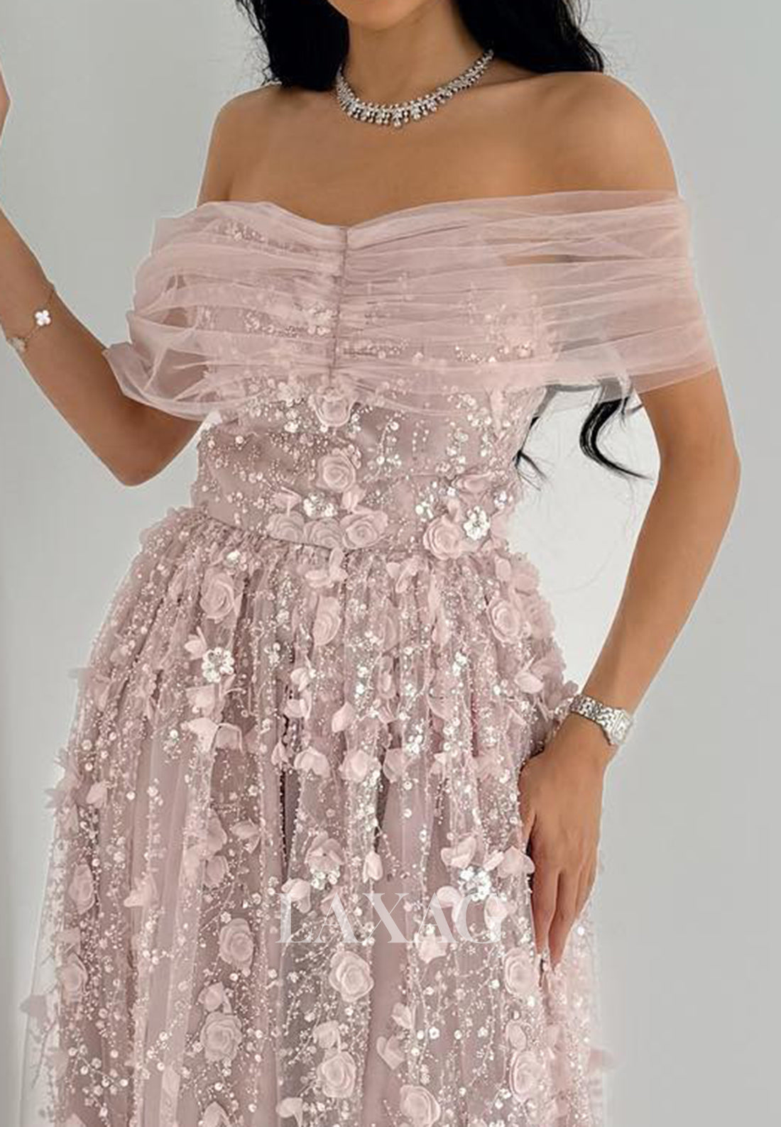 Sweetheart Sleeveless Floral Embellished Beaded Ankle-Length Pleated Tulle A-Line Evening Dress