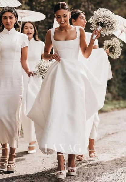 Square-Neck Off-Shoulder Pleated Satin Bride Gowns Straps Sleeveless Floor-Length A-Line Wedding Dress