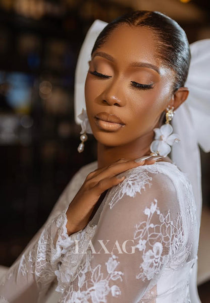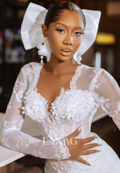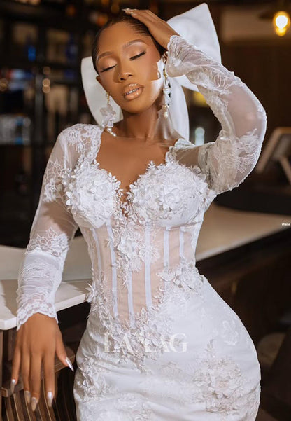Sweetheart Long-Sleeves Short Mermaid Wedding Dress Allover Lace Applique Cutout Boho Bride Gowns