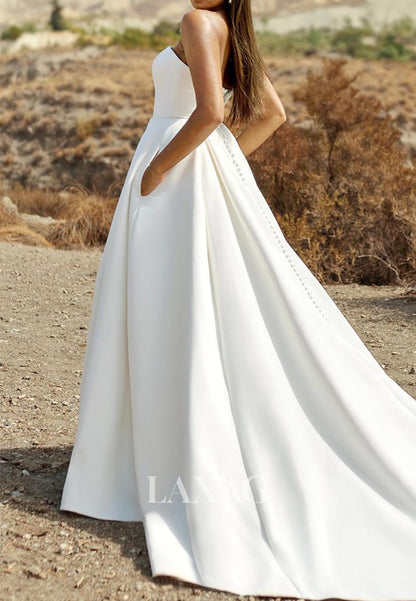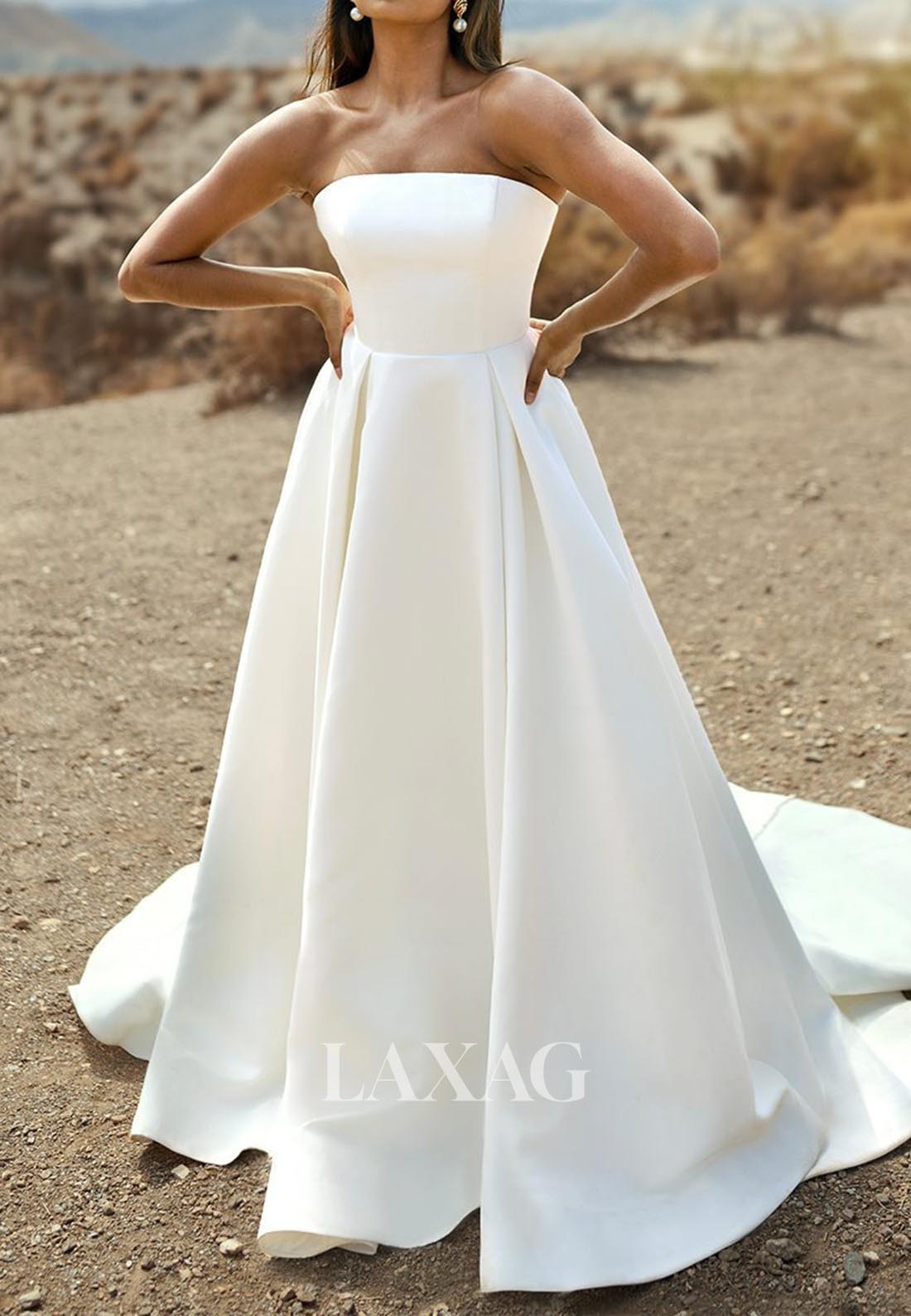Elevate your bridal elegance with this stunning off-shoulder wedding dress. The sleek tube top design and pleated satin fabric create a flattering A-line silhouette that flows gracefully into a sweep train. Perfect for the bride who desires timeless sophistication with a modern touch, this sleeveless gown combines simplicity with luxury for your unforgettable walk down the aisle.
