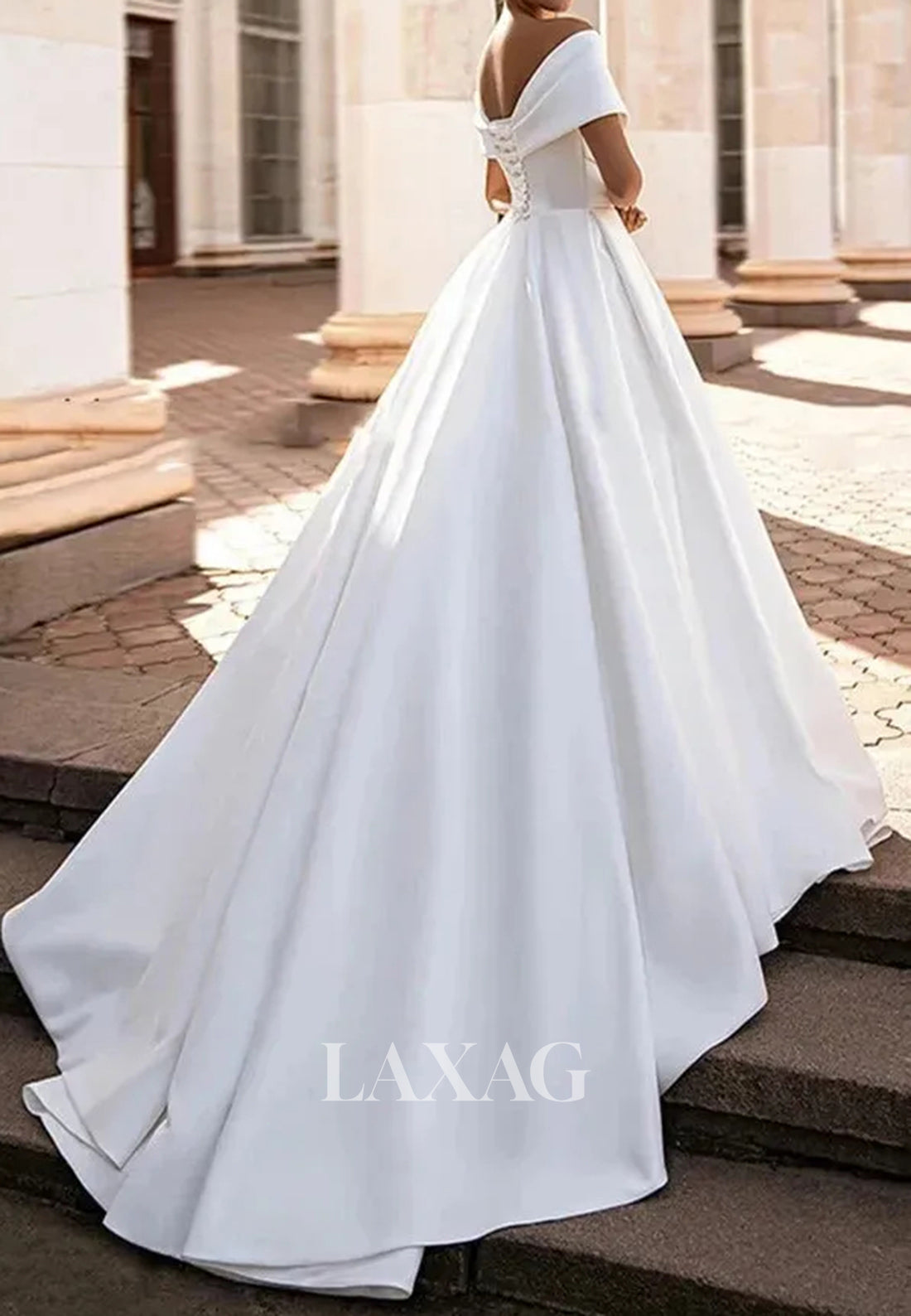 V-Neck Sleeveless A-Line Wedding Dress Off-Shoulder Pleated Satin Bride Gowns with Train