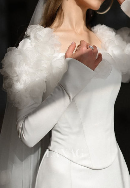 Scoop-Neck Long-Sleeves Tulle Floral Embellished Satin A-Line Wedding Dress with Tulle Train