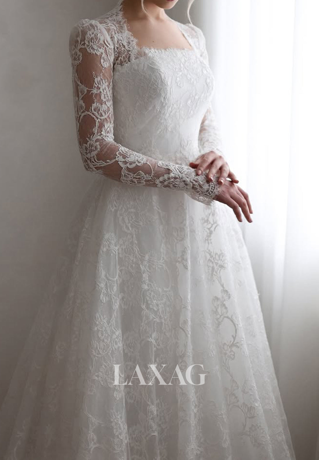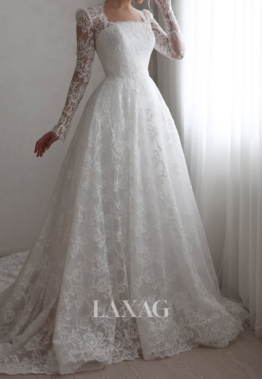 Square-Neck Long-Sleeves A-Line Wedding Dress Allover Lace Pleated Sheer Bride Gowns with Train
