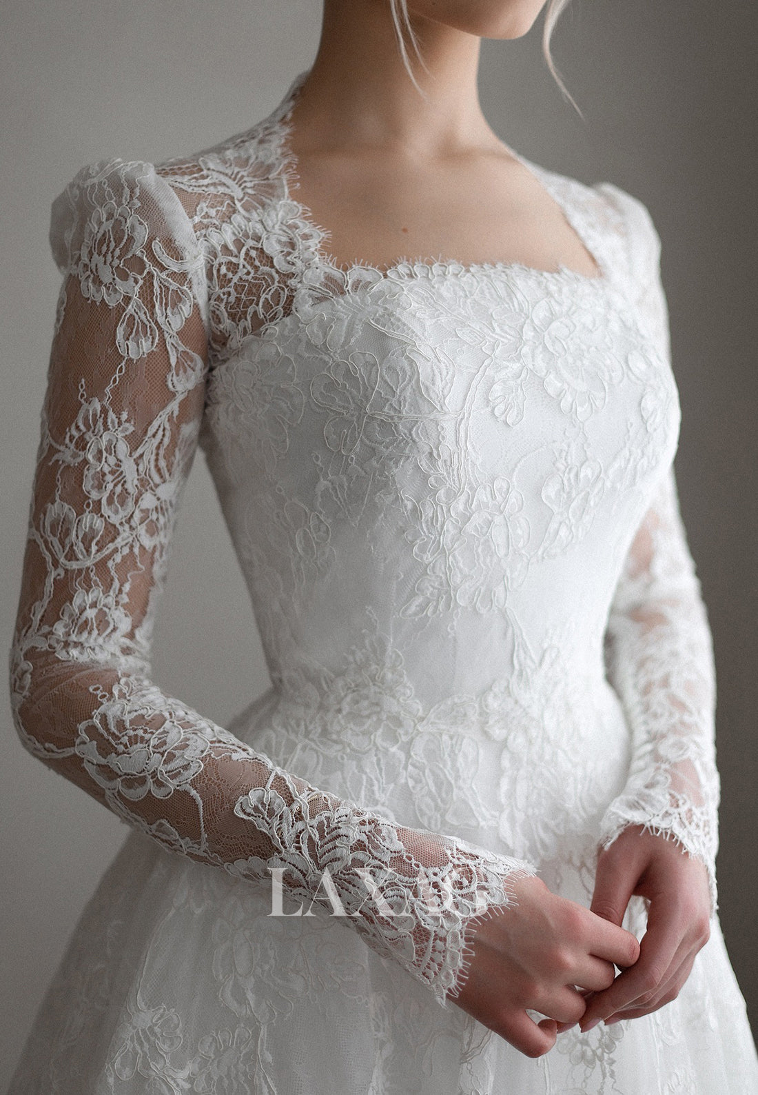 This elegant A-line wedding dress features a flattering square neckline and long sleeves, crafted from delicate allover lace. The pleated sheer fabric adds a romantic, ethereal touch, while the flowing train creates a graceful silhouette for your special day. Perfect for brides seeking timeless beauty and subtle sophistication.