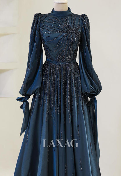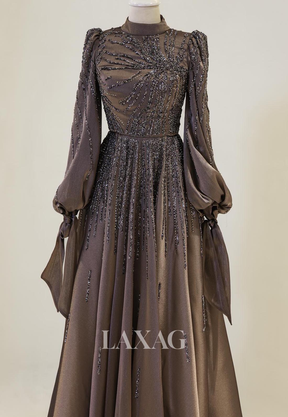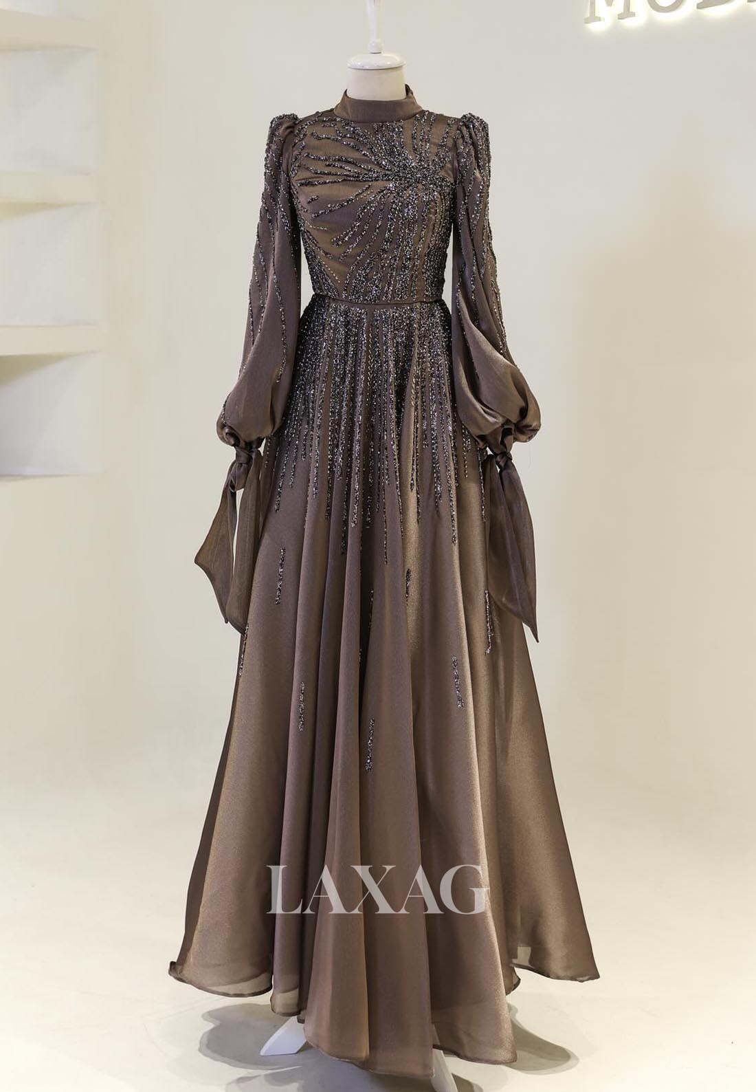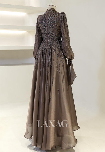 Elevate your style with our stunning High-Neck Long-Sleeves A-Line Mother of the Bride Dress! Featuring intricate beadwork and elegant pleating, this chiffon gown is perfect for any cocktail event. Feel confident and classy with its flattering A-line silhouette and high-neck design. Available now for a limited time!