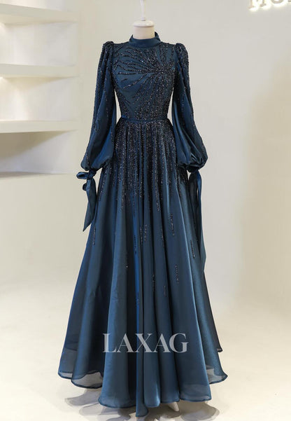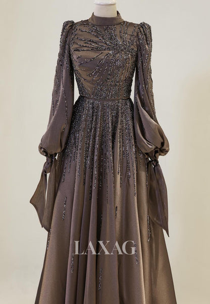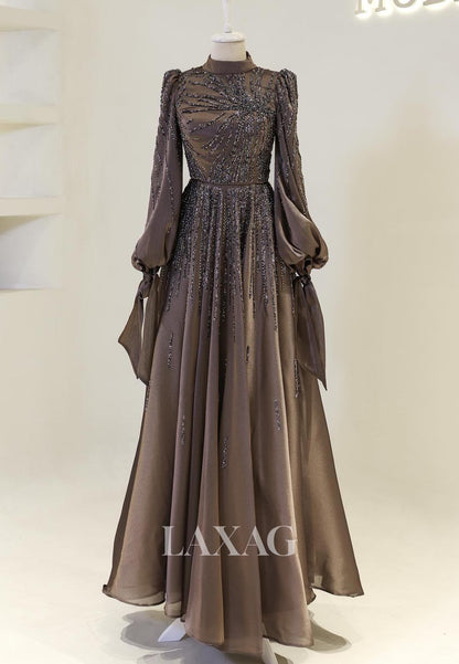 High-Neck Long-Sleeves A-Line Mother of the Bride Dress Beaded Pleated Chiffon Cocktail Gowns