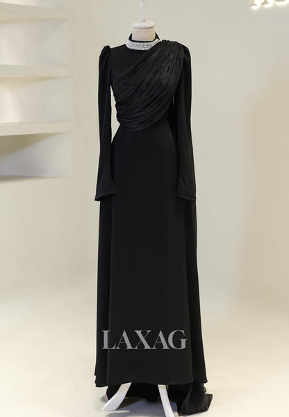 Beaded-High-Neck Pleated Fitted Mother of the Bride Dress Long-Sleeves Satin Cocktail Gowns