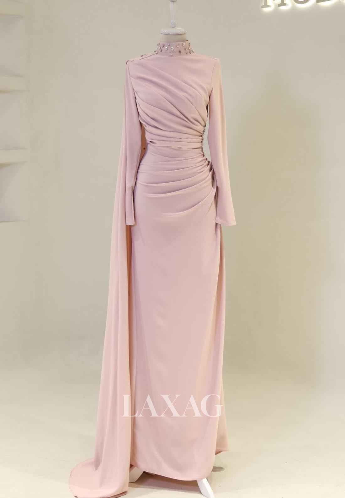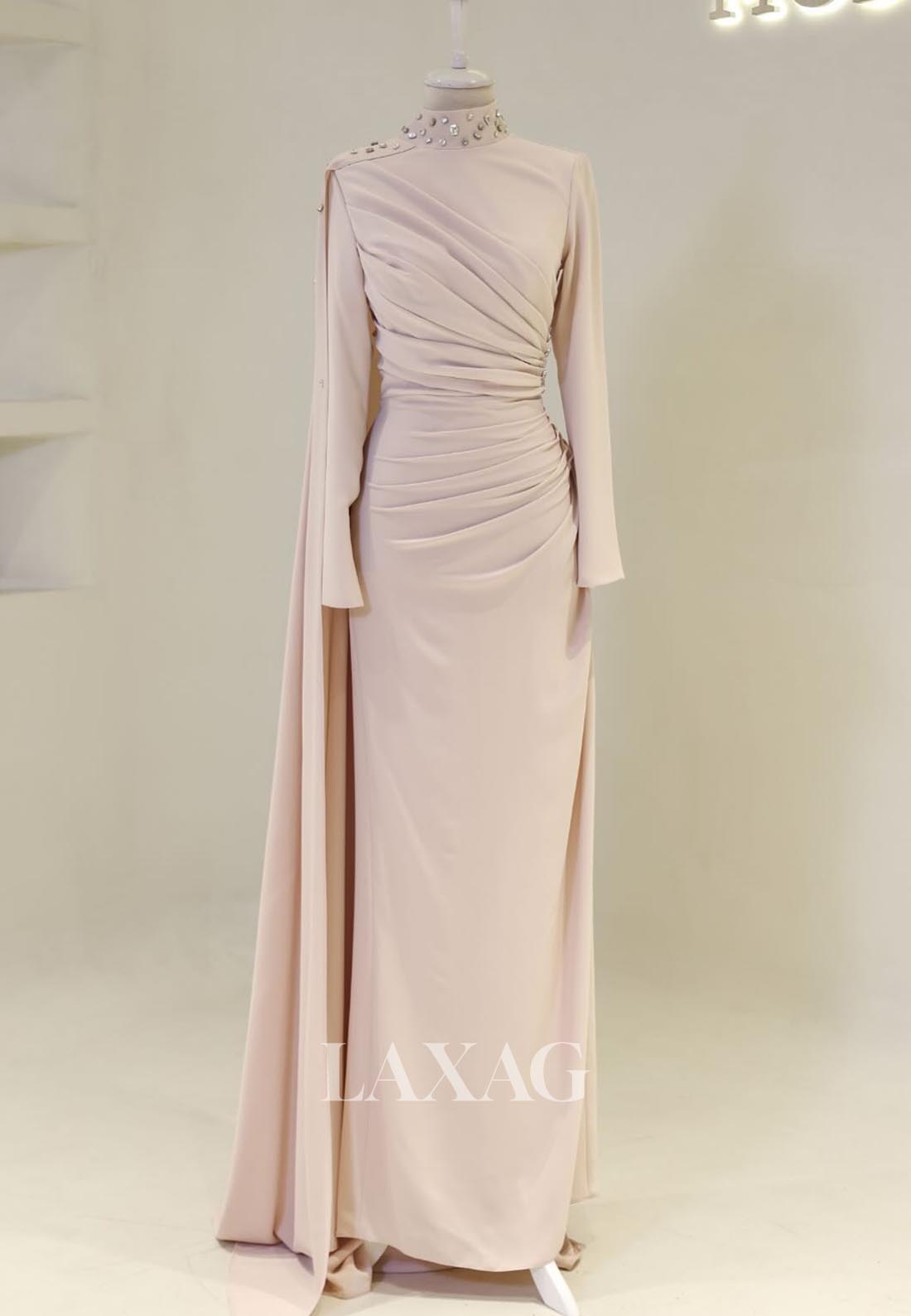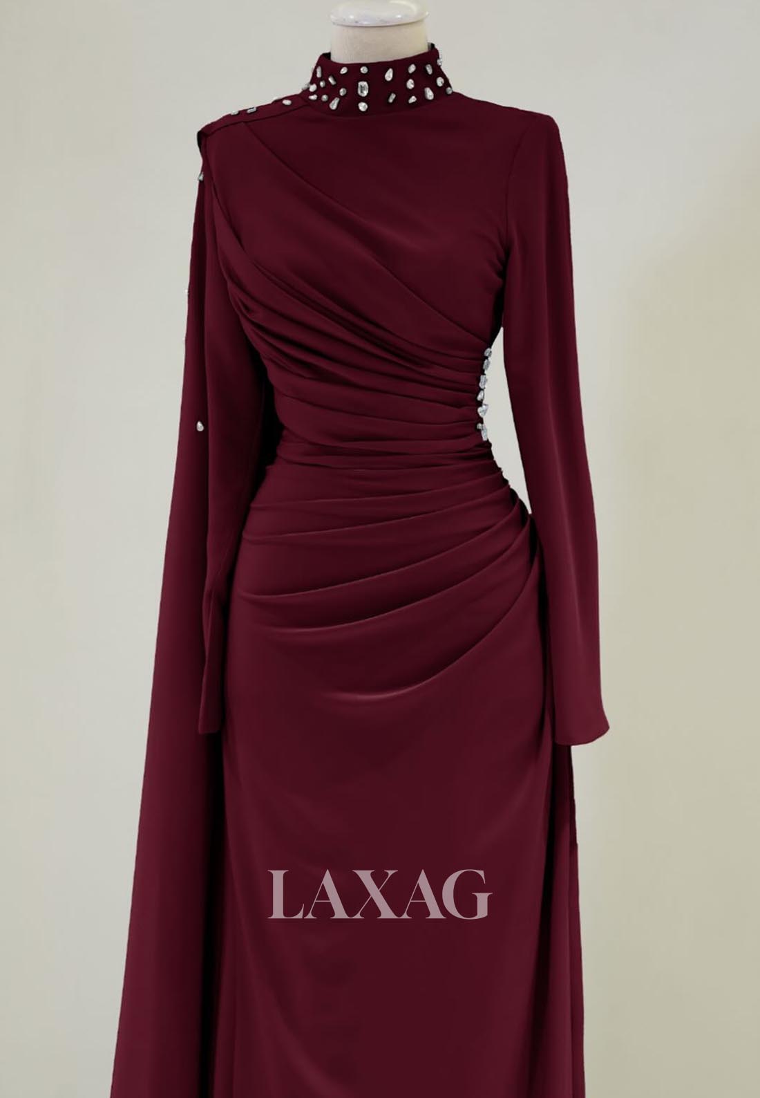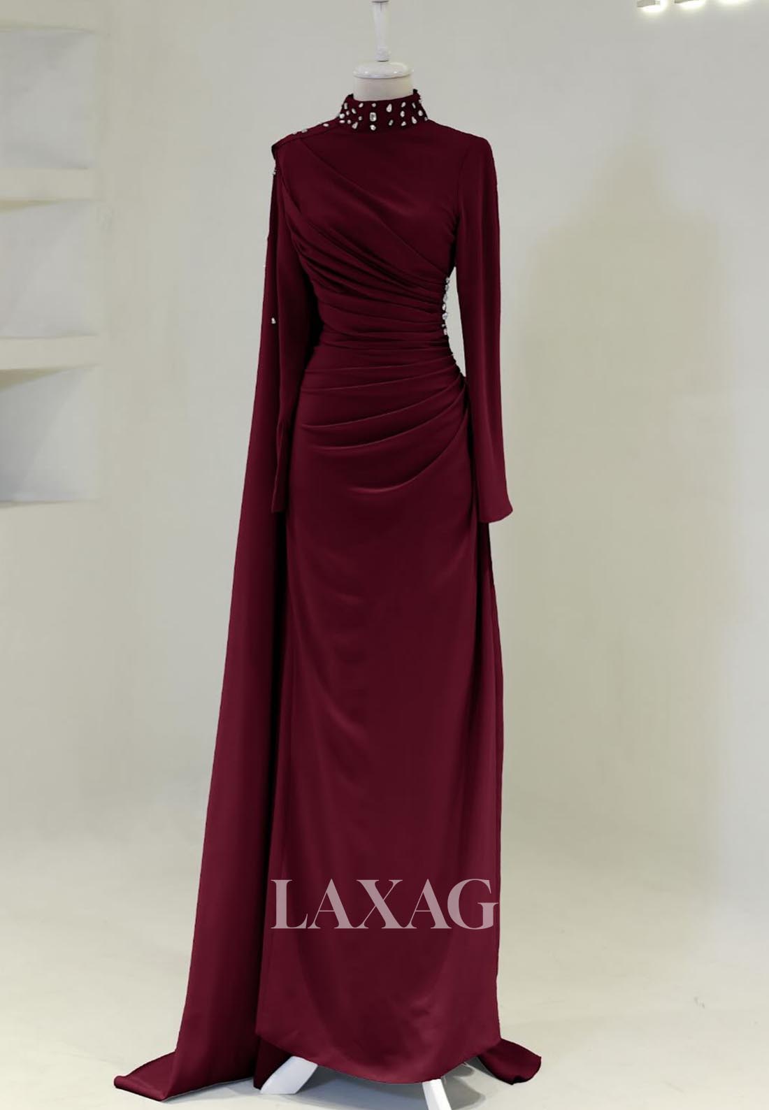 Long-Sleeves Satin Cocktail Gowns Beaded-High-Neck Pleated Fitted Mother of the Bride Dress