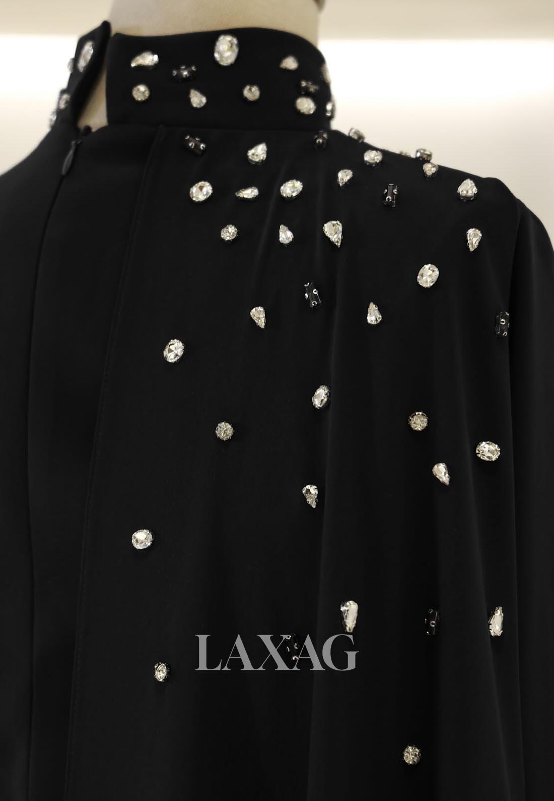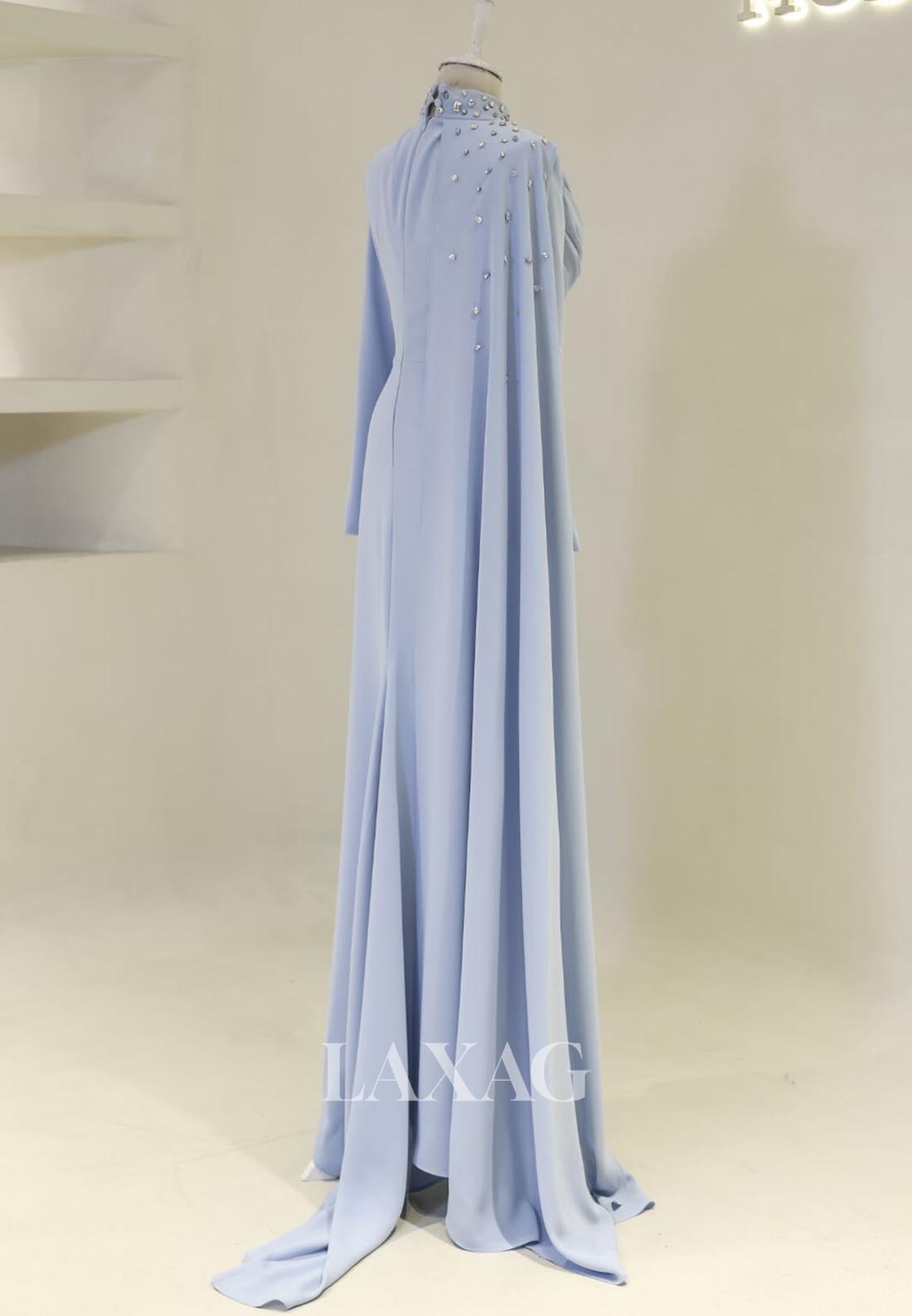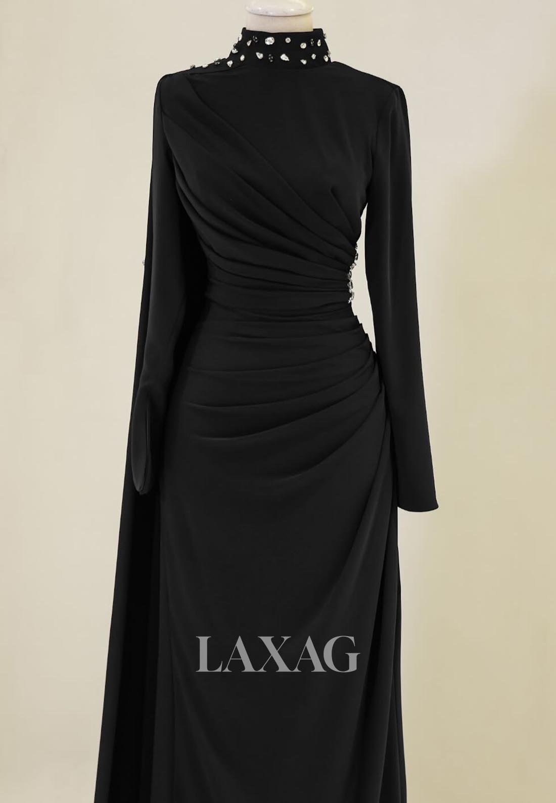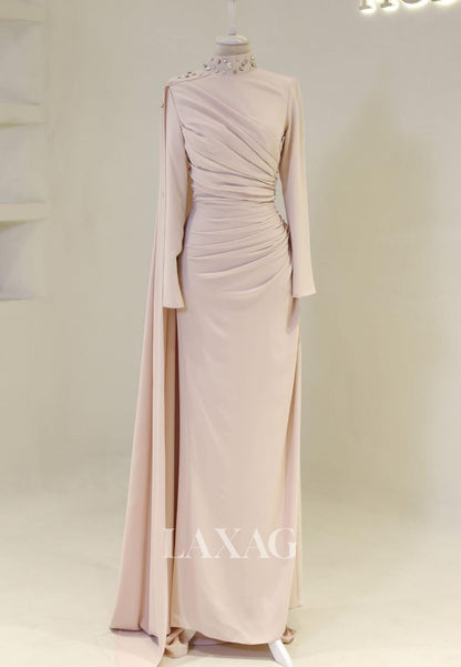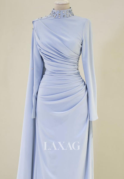 Long-Sleeves Satin Cocktail Gowns Beaded-High-Neck Pleated Fitted Mother of the Bride Dress