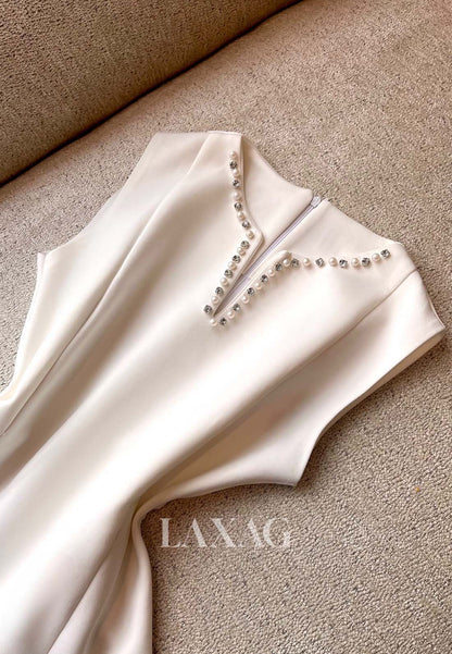 Deep V-Neck Cap-Sleeves Short Party Gowns Beaded Pleated Satin A-Line Homecoming Dress with Slit