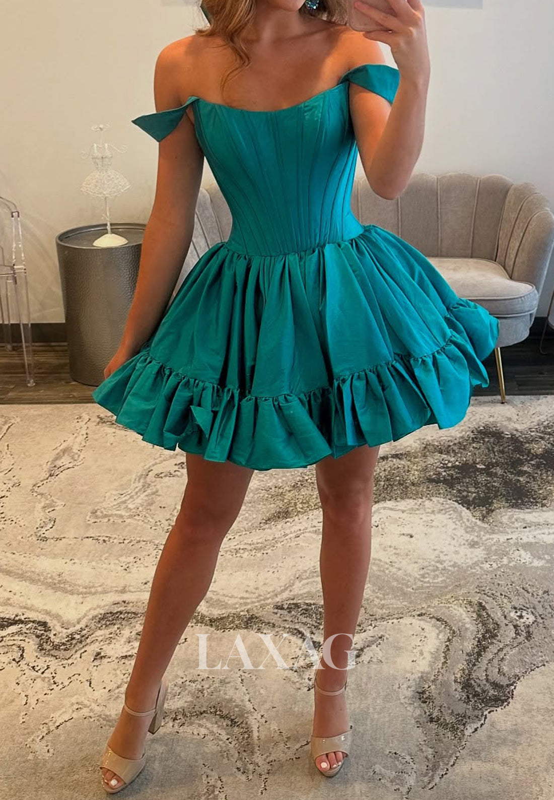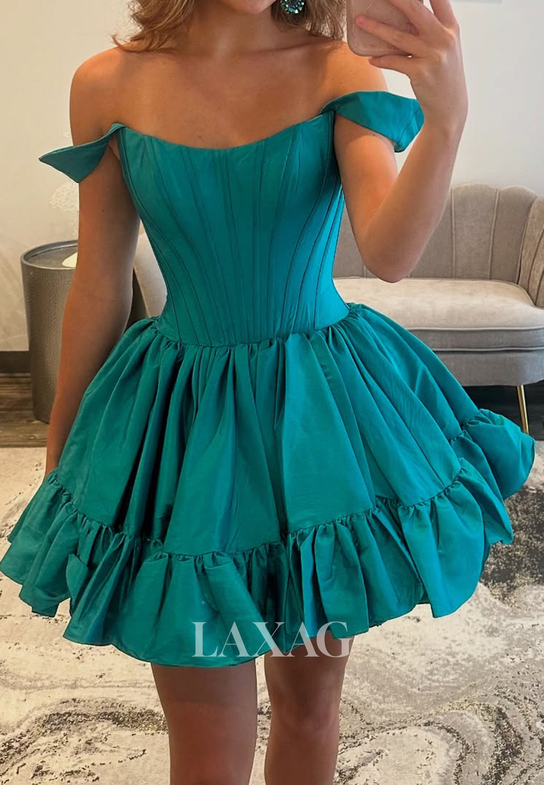 This elegant short party dress features a flattering scoop neckline and off-shoulder design that highlights your shoulders with grace. Crafted from smooth satin, its sleeveless, pleated bodice flows into a charming A-line silhouette, perfect for homecoming or any special occasion. Comfortable and stylish, this dress ensures you stand out with effortless sophistication.