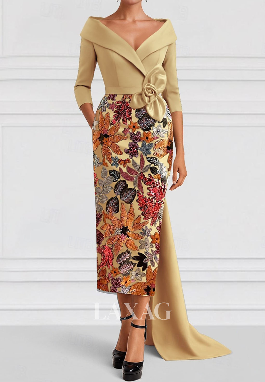 V-Neck Collared Tea-Length Mermaid Evening Dress 3/4-Sleeves Sequined Applique Satin Formal Gowns
