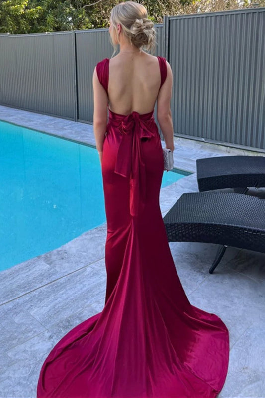 V-Neck Straps Sleeveless Floor-Length Satin Pleated Mermaid Prom Dress with Slit