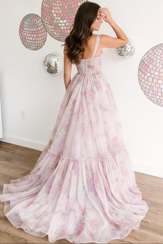 V-Neck Spaghetti Straps Sleeveless Print-Tulle Floor-Length Tiered A-Line Prom Dress