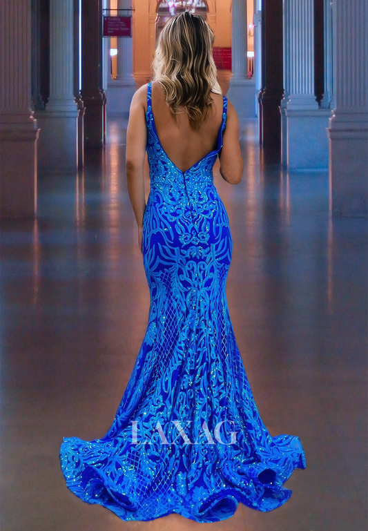 Trumpet&Mermaid Prom Dress V-Neck Spaghetti Straps Open Back Blue Party Dress