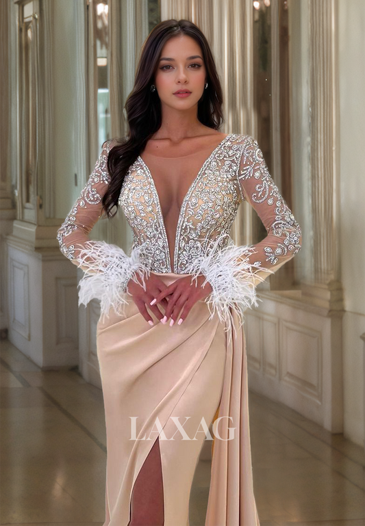 Deep V-Neck Long-Sleeves Pleated Prom Dress Beaded Applique High Slit Feathered Formal Gowns