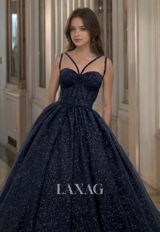 Ornate Spaghetti Straps Sweetheart A-Line Prom Dress Glitter-Knit Beaded Cutout Formal Gowns