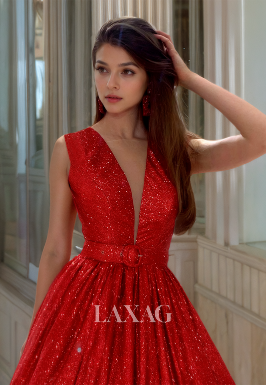 Deep V-Neck Sleeveless A-Line Formal Prom Dress Pleated Glitter-Knit Evening Gowns with Train