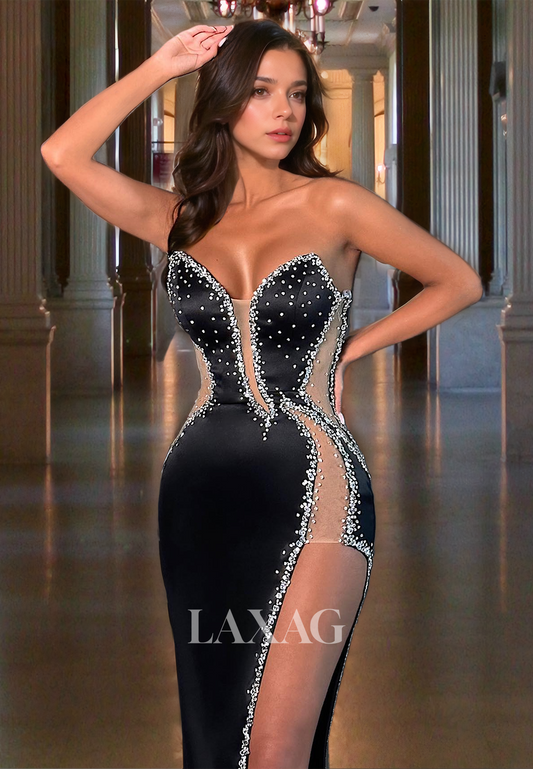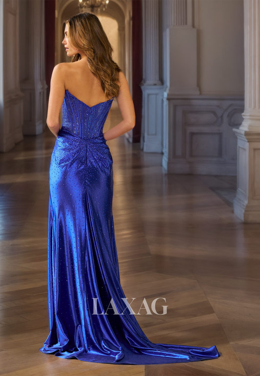 Strapless High Slit Floor-Length Evening Gowns Sweetheart Sleeveless Beaded Pleated Prom Dress