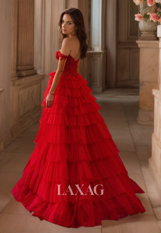 A-Line Off-Shoulder Tiered Tulle Prom Dress Sweetheart Sleeveless Beaded Applique Evening Gowns