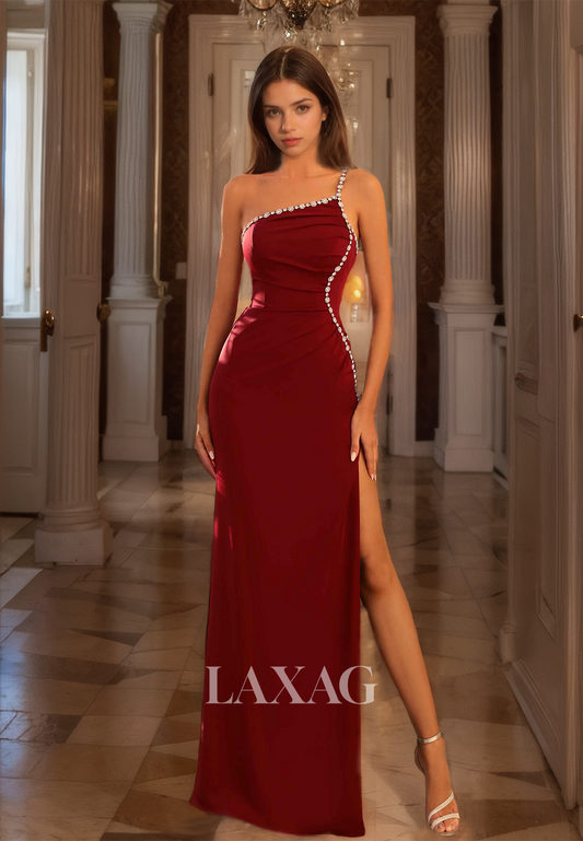 Asymmetrical-Neck Sleeveless Pleated Mermaid Prom Dress Beaded Rhinestones Evening Gowns with High Slit
